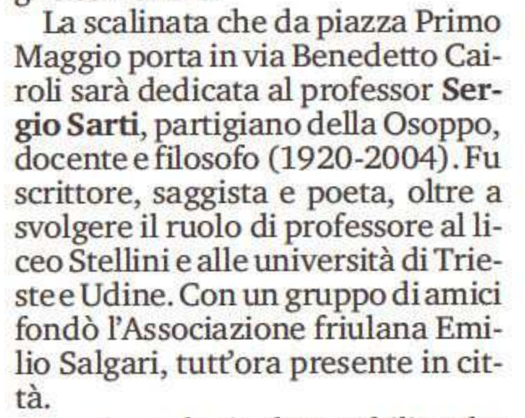 La toponomastica delle strade cittadine è frutto della sensibilità del tempo in cui viene data (che è vero a volte cambia, come sta succedendo con le statue negli schiavisti in USA), ma è anche uno specchio dei tempi. Ricordare il prof. Sergio Sarti, mio padre, dedicandogli la scalinata che da piazza I° Maggio sale a via Cairoli (a destra del Liceo Stellini), significa rendere omaggio a una persona che è stata certamente pubblica (come partigiano osovano, docente allo Stellini e all’Università, filosofo, drammaturgo, fondatore di attività culturali, ecc.) ma senza protervia e volontà di protagonismo. Al contrario si potrebbe dire che il centro del suo pensiero sono sempre stati gli “altri”: nella sua concezione politico/filosofica è fondamentale il rapportarsi con il pensiero altrui e questo era evidente anche nella centralità del rapporto con gli studenti liceali e universitari, che probabilmente proprio per questo lo ricordano con affetto, avendone percepito la disponibilità. Anche l’esperienza partigiana non viene esibita, ma utilizzata per meglio comprendere e riproporre come storico gli eventi della “Osoppo” e dei suoi martiri caduti.