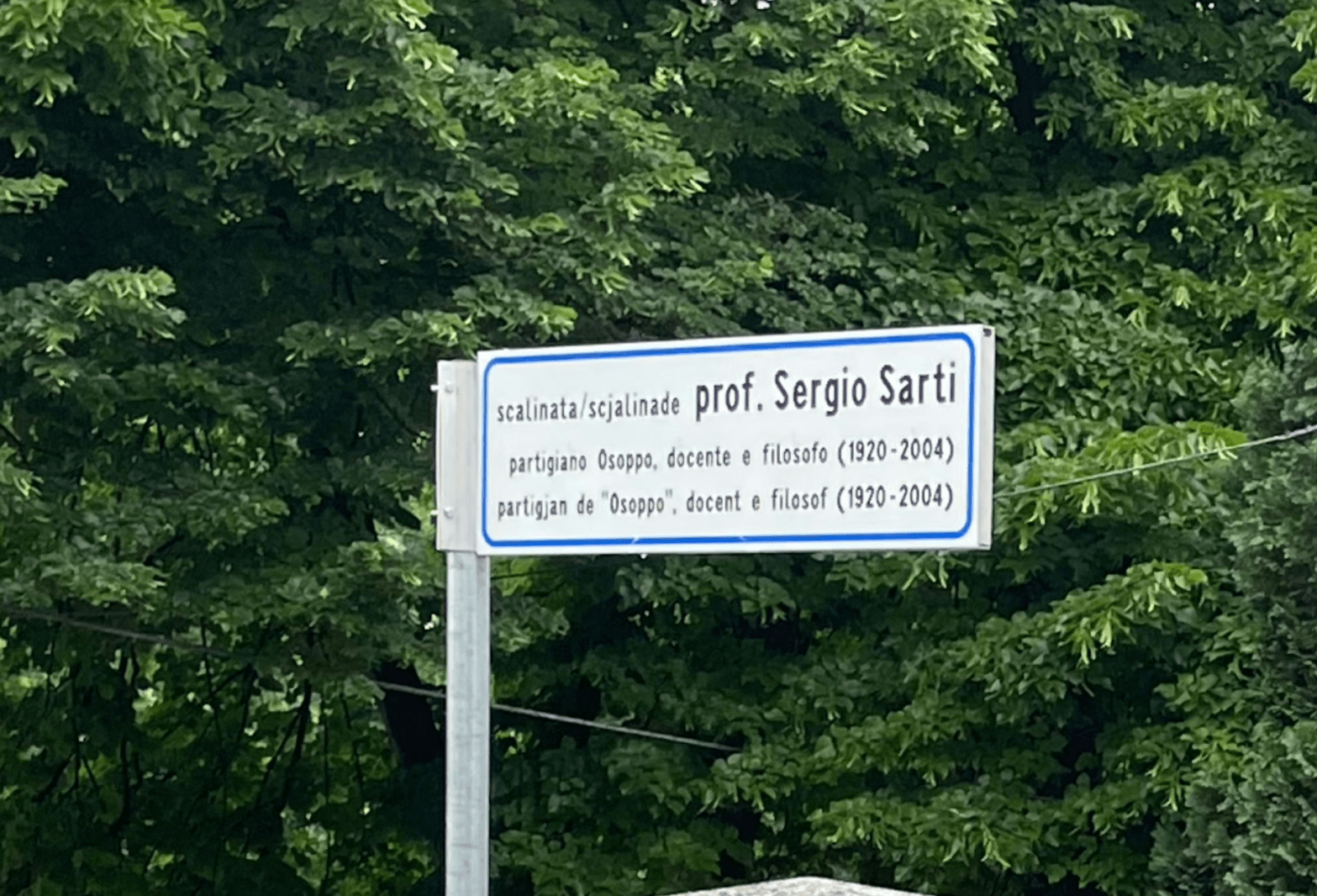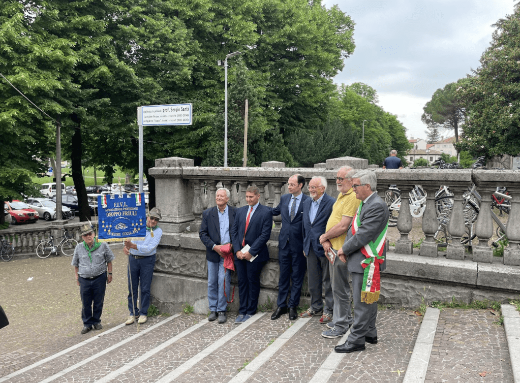 Si è svolta il 25 maggio 2022 alle ore 11 l’intitolazione della scalinata che unisce piazza I maggio con via Cairoli sul lato destro dello Stellini guardato di fronte. È stata intitolata al filosofo e partigiano della Osoppo, nonché prima studente e poi professore del liceo classico, oltre che delle università di Trieste e Udine, Sergio Sarti. La cerimonia chiude un biennio di celebrazioni apertosi nell’anno centenario della nascita del filosofo. In quell’occasione gli vennero dedicate ben tre pubblicazioni da La Nuova Base editrice di Vittorio Zanon. Un suo pezzo teatrale, Missione in Northumbria, racconti e saggi sulla Resistenza curati dall’architetto Roberto Volpetti ed una mia monografia sui suoi lavori filosofici intitolata La lezione di Sergio Sarti. Gli eventi pandemici consentirono di portare a termine fino ad un certo punto i numerosi appuntamenti del 2020 dedicati al filosofo udinese. In particolare non si riuscì a tenere il convegno conclusivo, con tutti gli esperti e i responsabili delle associazioni che avevano promosso l’iniziativa, e venne sostituito con un video girato da Andrea Marmai. Quell’anno ci fu un’edizione speciale del Premio Sergio Sarti per gli studenti dei licei promosso dalla famiglia e organizzato fin dal 2005 dalla professoressa Elettra Patti, con tracce ispirate agli scritti di Sarti.
