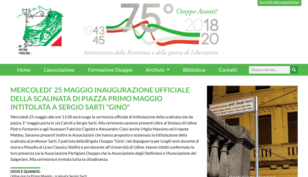 Mercoledì 25 maggio si è svolta a Udine la cerimonia per la inaugurazione della scalinata che da piazza Primo Maggio porta a via Cairoli e dedicata a Sergio Sarti per lunghi anni insegnante di storia e filosofia presso l’adiacente Liceo Stellini.