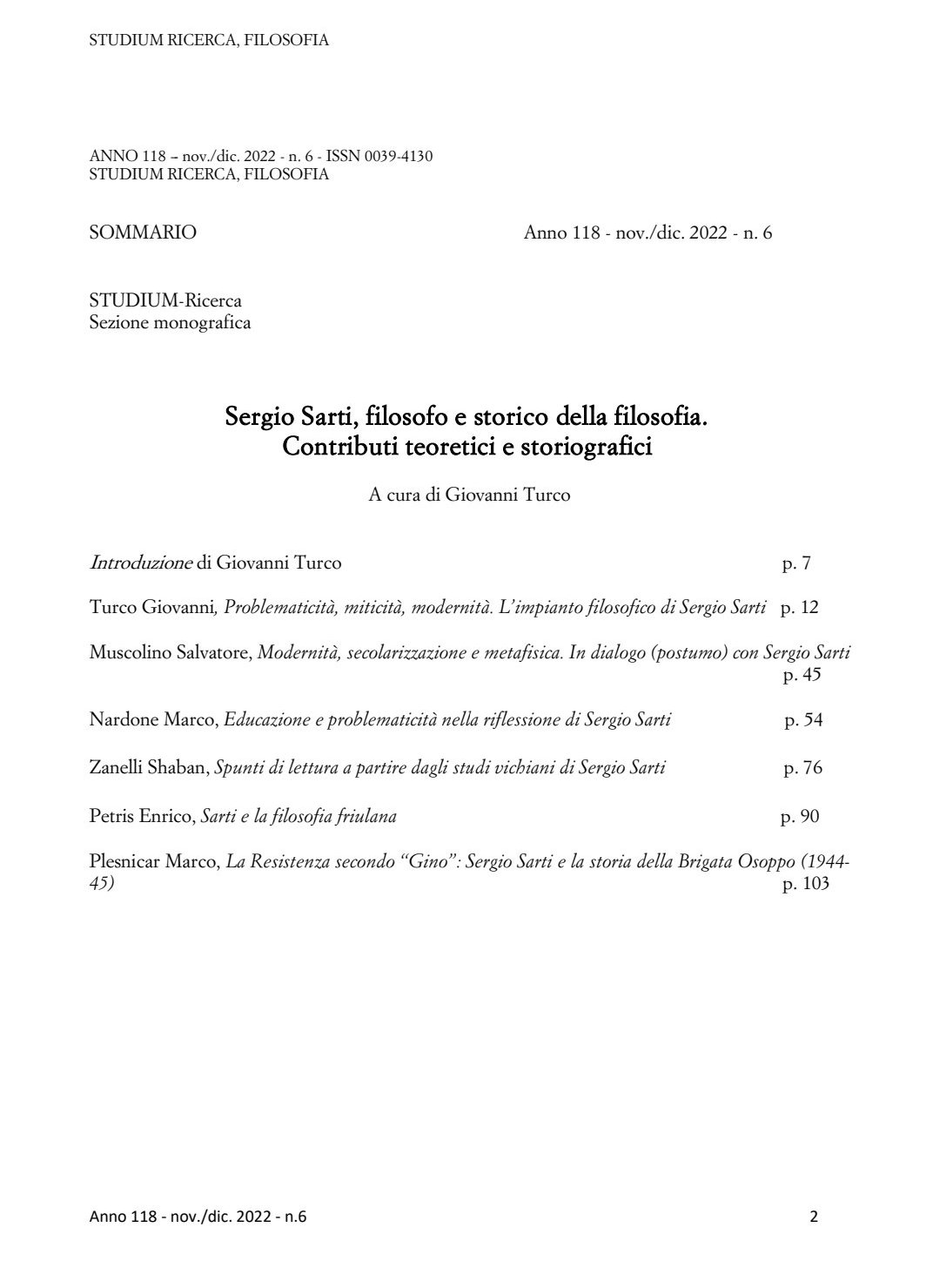 La Rivista STUDIUM Ricerca ha dedicato il numero Anno 118- nov./ dic. 2022 – n.6 a: “Sergio Sarti filosofo e storico della filosofia. Contributi teoretici e storiografici” a cura del prof. Giovanni Turco.