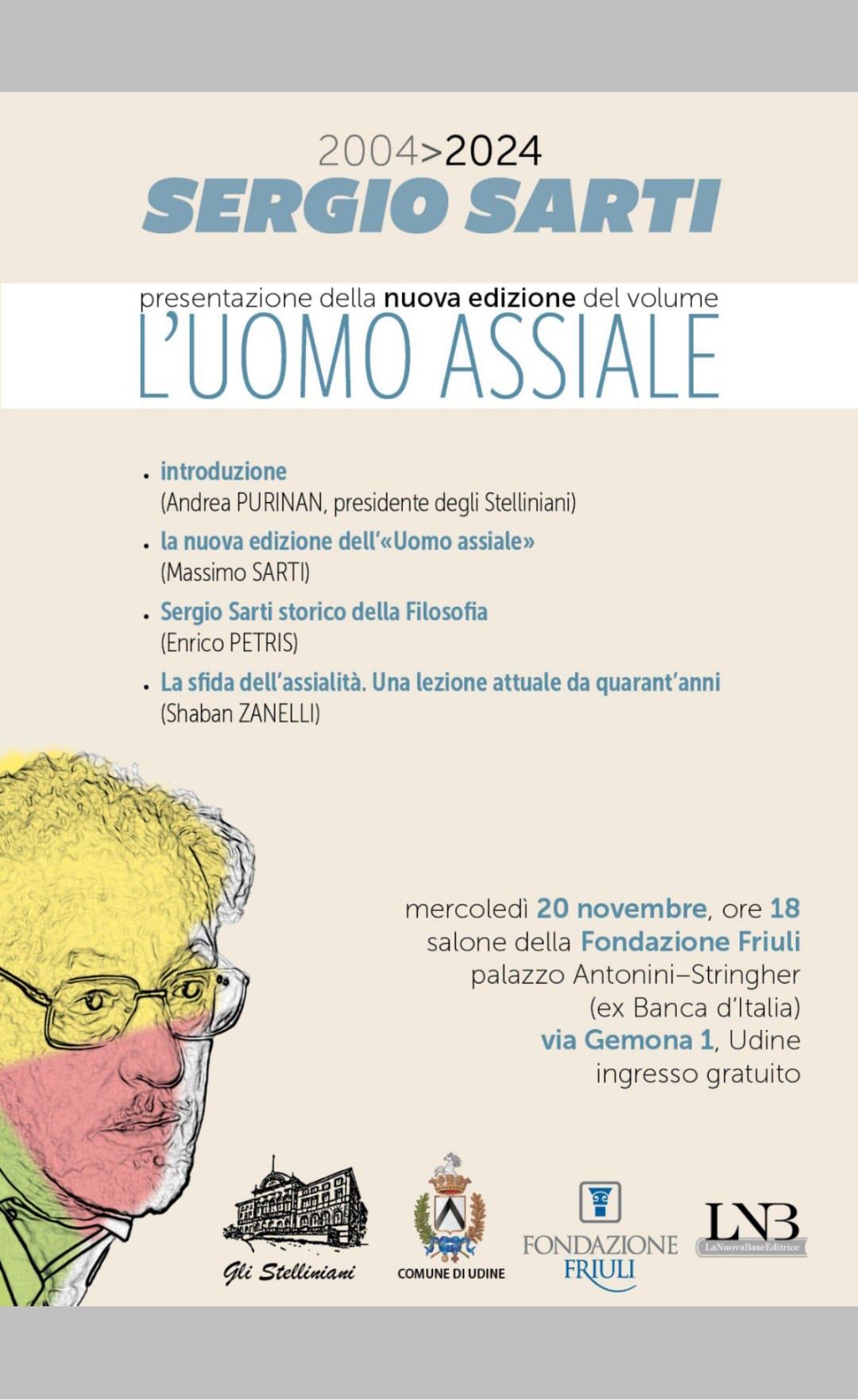 Mercoledì 20 novembre 2024 presso il palazzo Antonini-Stringher a Udine verrà presentata la nuova edizione del libro “L’UOMO ASSIALE” scritto da Sergio Sarti. Salone della Fondazione Friuli: Palazzo Antonini-Stringher (ex Banca d’Italia) via Gemona 1, Udine Orario mercoledì 20 novembre ore 18